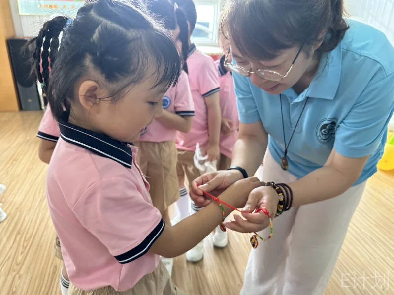 基金会的义工代表为每位小朋友系上五彩绳,祝福他们和家人能够幸福安康、未来的生活五彩缤纷。