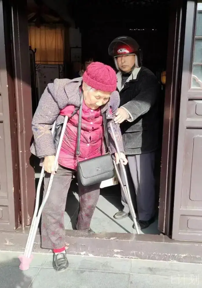 在儿子的陪同下,夏奶奶拄着双拐,一步一步坚持自己完成善举,这份坚毅和信仰值得我们敬佩。