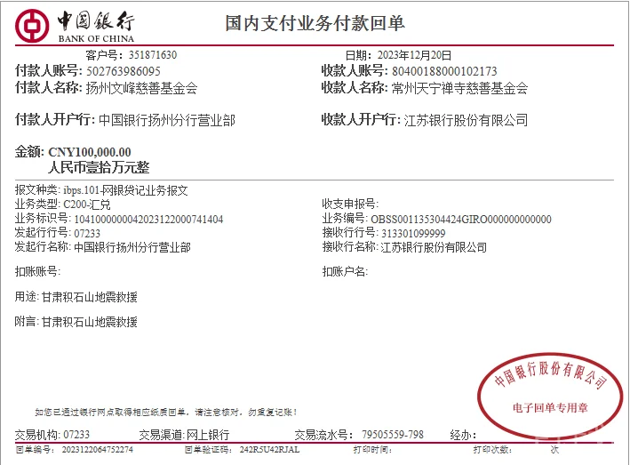 一方有难,八方支援。甘肃地震发生后,扬州文峰慈善基金会立即发动社会各界爱心人士,共同伸出援手支援地震灾区。今日本会捐赠人民币10万元,用于“12·18 甘肃积石山地震救援”项目。