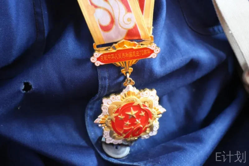 深蓝色的中山装像深邃的夜空,补丁、破洞如星辰,仔细端详,一枚“庆祝中华人民共和国成立70周年”纪念章闪耀着夺目的光彩!纪念章为表彰中华人民共和国成立前参加革命工作的、健在的老战士老同志而颁发!