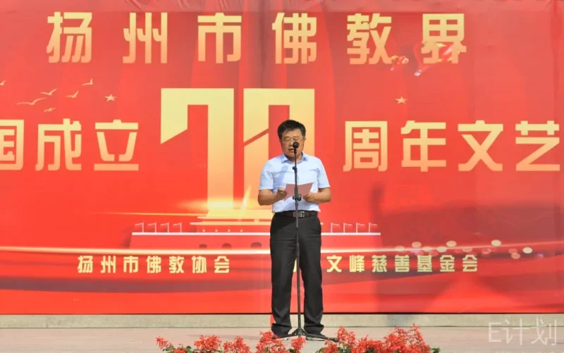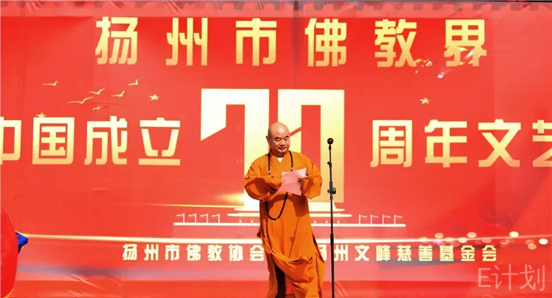 扬州市委统战部副部长、扬州市民族宗教事务局局长朱建明先生讲话。扬州市佛教界以载歌载舞的文艺方式,讴歌新时代,表达对伟大祖国的美好祝福。相信在扬州市佛教协会的团结带领下,扬州市佛教界将会以更加饱满的精神投入建设“富强美高”新扬州的征程中。
